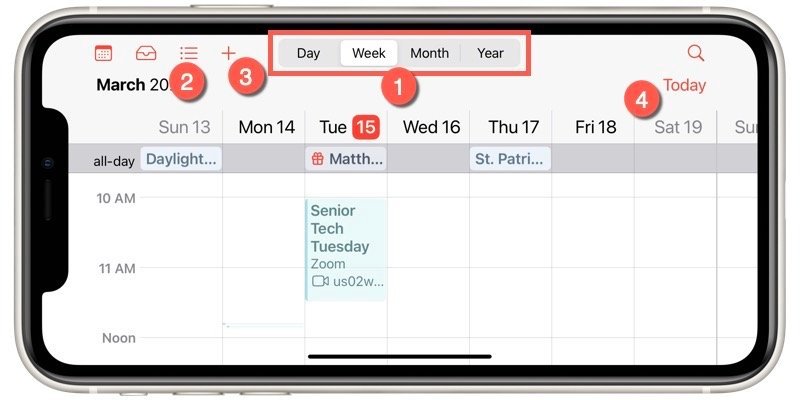 Week-at-a-Glance: A week-at-a-glance calendar is available from the monthly or yearly calendars by tipping your iPhone to landscape or horizontal mode.