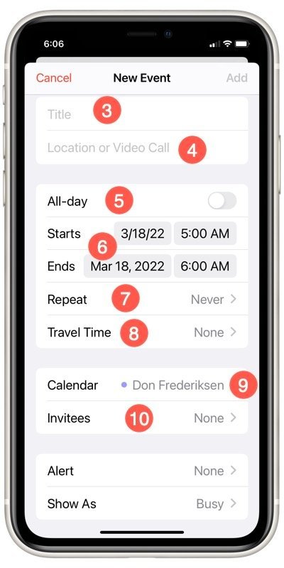 4 Indicating a Location for the event is optional or can be very specific to include an address. If you start to type, the app will use recent locations, locations from the Maps app and locations from your Contacts app as suggestions.