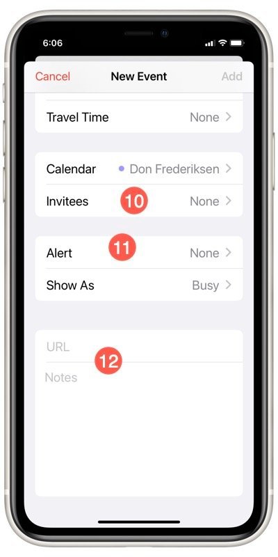 12 URL & Notes – You can add a website and notes to the event. Notes might be information about the meeting or event. This could be agenda items, location details and more.